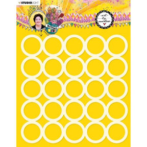A mask with circles that would make a great background for cards, mixed media projects, journals and more.