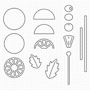 The delicious drink is just the beginning — we eat with our eyes, so the garnish that makes it pretty (and adds some flavor as well) is an essential component of your beverage presentation! The Garnish die set includes fruity treats, a salty olive, and fresh mint sprigs to complete your delectable refreshments. In addition, two straws and a drink stirrer are also included. These accents elements are sized to coordinate with the Barware Basics and Long Stem Barware die sets.
