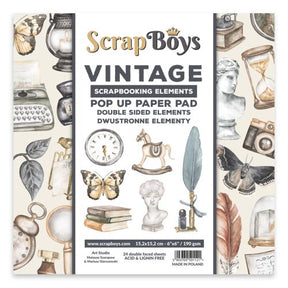 ScrapBoys. Pop up Paper pad: 15,2 x 15,2 cm / 6x6 Inch. Grammage: 190 gsm. Scrapbooking elements - double sided elements. 24 double faced sheets. Acid & lignin free. Made in Poland. VINTAGE - block with elements for works in vintage / retro style.