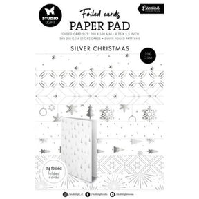 Essentials by Studio Light. Foiled Cards Paper Pad Silver Christmas. 24x folded cards, size: 108x140mm / 4.25x5.5 inch. 3x 8 designs. 210 gsm, 142# cards with foiled patterns. Complete size: 140x216x5mm. Content: 24 Sheets.
