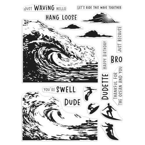 Featuring an epic wave, ten sentiments, surfers, and sun-and-cloud stamps, this set will have you dreaming of paddling into the surf — or at least enjoying the view from the beach.