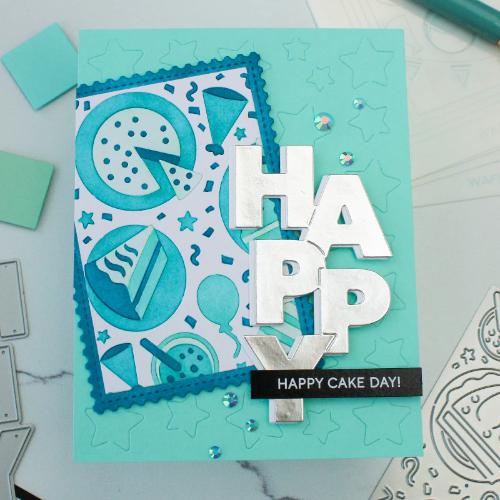 This Sepia Layers Stencil is designed for quick projects. Use 4 shades (light to dark) with one color per layer, no masking needed. The Cake Time Stencil gives you more flexibility for colorful looks and is ideal for adding glitter paste to the confetti, since they’re all on one layer.