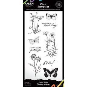Bring heartfelt beauty to your projects with the Grove Notes 4in x 8in Clear Stamp Set from Arden Creative Studio. Designed by Katie Pertiet, this set includes 9 stamps featuring a mix of elegant florals, fluttering butterflies, and warm, thoughtful sentiments - perfect for adding a meaningful touch to your cards, journals, scrapbook pages, and more. Whether you're creating layered backgrounds or spotlighting individual elements, the versatile mix of imagery and text offers endless creative combinations. Made from high-quality clear photopolymer, these stamps provide crisp impressions and precise placement every time. A beautiful addition to any crafter's collection, Grove Notes is ideal for expressing emotion through art. Includes 9 Individual stamps 10.16 x 15.24(cm), 4.0 x 6.0 (inches).