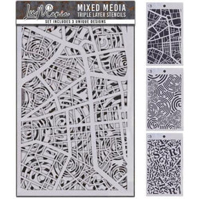 LuMania Stencil Mix Triple Layer Set. Pack of 3 individually designed stencils. 12,7x20,3 cm/ 5x8 inch, thickness 0,3 mm. Paint colour and ink compatible, easy to clean. Highly resistant. Resusable and long lasting.