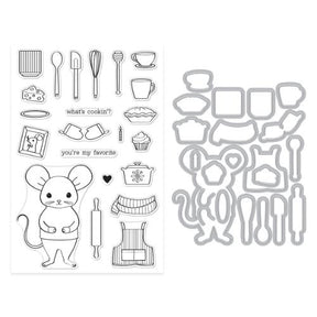 What's Cookin'? Stamp & Cut Set is from the Retro Kitchen Collection. You can have the cutest sidekick in your kitchen with this adorable Stamp & Cut set. A mouse takes center stage, measuring 2" x 2 3/4", and comes with lots of accessories to make sure he's the perfect cook for your kitchen. Whether you give him an apron and potholders or a cup of coffee and a pie, there are lots of options to customize your new friend and set the perfect scene. This set includes both the clear stamp set and the coordinating etched dies, giving you even more options to cut out the elements. The mouse is sized perfectly to work with DF246 Classic Cabinet Dies, making a charming setting for this tiny cook.