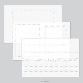 Add stenciled dashed lines with the Kristina’s Finishing Touches Stencil Pack. Rectangles are sized for A7 and A2 cards. Three 6" x 9" stencils.