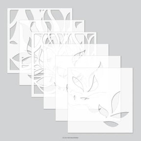 Add ink and color to the Long Line Leaves Stamp Set images and Long Line Leaves Background Stamp. Six 6” x 6” stencils.