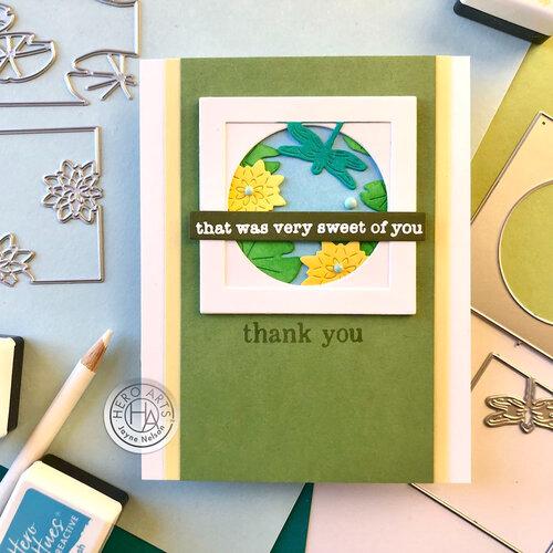 Build a dimensional window into your next card with this Looking Glass Lily Pond die set, featuring lily pads, blossoms and a dragonfly. Looking Glass Fancy Dies are designed to layer in a variety of configurations to build square scenes. Ideally sized for both regular and slimline cardmaking and perfect in combination with stamped images. Set of three dies. Use with the Hero Arts Alignment Tool Stencils (HERO-STN-HT206 abd HERO-STN-HT207) for easy placement.
