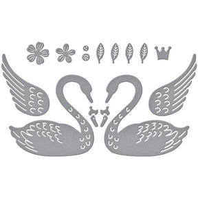Heart Swans Etched Dies is part of the Truly Yours Collection. This lovely ensemble includes two facing swans that create a heart shape between them. There are wings that can be cut and popped up for dimension, along with beaks and bills for coloring. Other designs in this set of thin metal dies include two different sizes of flowers and its centers, four leaves and a crown. Truly Yours Collection is full of classic and timeless designs. This package contains Spellbinders Etched Dies
