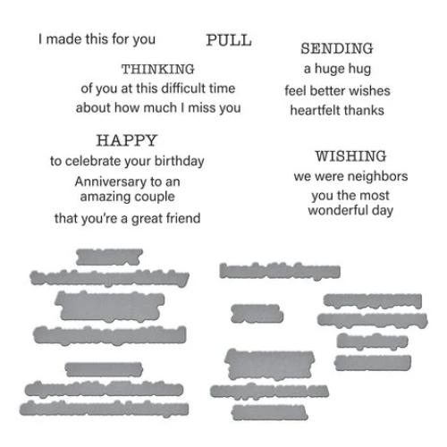 Tabbed In & Out Sentiments Clear Stamp & Die Set is from the Tabbed Classic Collection by Wendy Vecchi and is a set of six clear stamp of words and sentiments with its matching six thin metal cutting dies. Each uppercase "main" words (SENDING, THINKING, HAPPY and WISHING) has supporting sentiments grouped together on a clear stamp. Stamp and then cut them all at once with the matching die for lots of sentiment options. Also, included are the word PULL and the sentiment "I made this for you," in both stamp and die format. This set works perfectly with S6-260 Essential Envelope Every Day Add-Ons Die Set.
