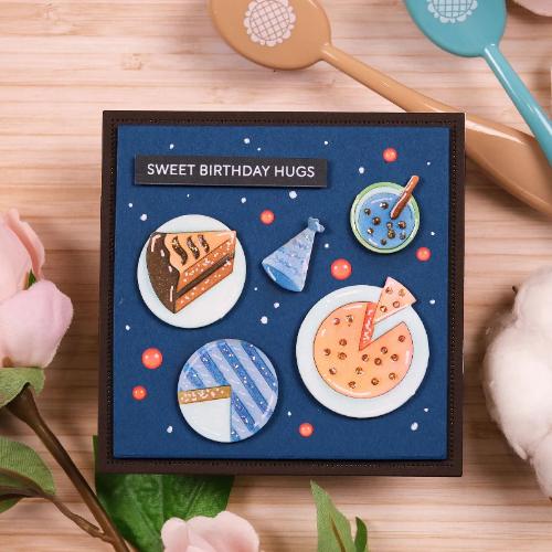 The Cake Time Sepia Layers Stencil is designed for quick projects. Use 4 shades (light to dark) with one color per layer, no masking needed. The Cake Time Stencil gives you more flexibility for colorful looks and is ideal for adding glitter paste to the confetti, since they’re all on one layer.