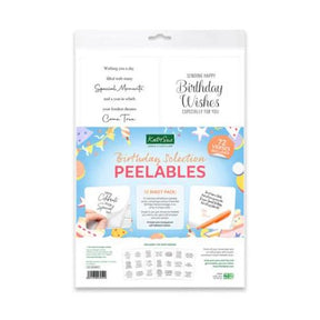 This selection of birthday themed Peelables swiftly adds stylish verses to your card or craft projects. Containing 72 self-adhesive verses for Birthday celebrations, these transparent peelable stickers can be used on the front or inside of your project. Featuring a variety of Birthday sentiments, you'll find the perfect greeting for all ages. Simple to use: choose a verse, peel it off and place it onto your project. Gently rub it down with a cloth to remove any air bubbles and you'll be delighted with the results. Peelables are an ideal product for anyone who does not have a computer/printer or for someone who wants that quick, convenient instant verse for their card or project. Details: 72 peelable stickers in 36 designs; 12 matt transparent self-adhesive A4 sheets; Sticker size: 99mm x 93mm; Easy to use, simply peel and stick onto your project; Made in the UK.