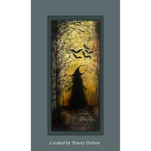 Esme the witch stands in silhouette with conjuring arms outstretched.