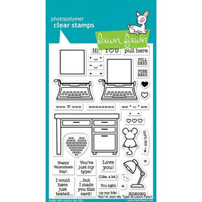 This fun stamp set is just your type! Featuring a typewriter, desk, and a cute “typing” mouse, this set is perfect for “I love you” cards, Valentine’s Day, or cards for co-workers.