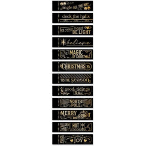 Memory Box Christmas Magic Labels Black Foil Tabs include 24 gold-foiled greeting tabs, each featuring a different winter design. This pack contains two of each design, with little dots on the left side and a variety of seasonal patterns accompanying the sentiments. The sentiments include: