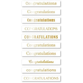 Memory Box Congratulations Foil Greetings White Tabs provide 40 white greeting tabs, each featuring gold-foiled “Congratulations” text in 10 different fonts. This pack includes 4 of each of the 10 unique designs. Each tab measures approximately 1.75 x 0.25 inches, offering a stylish addition to your projects.