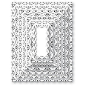 Memory Box Fan Stitch Scalloped Frames Dies, part of the Joyful Season Collection, are crafted from durable steel and compatible with most die-cutting machines. These wafer-thin dies cut cleanly through cardstock, felt, fabric, and shrink plastic. The set includes 7 detabbed dies mounted on a magnetic sheet, perfect for nesting and layering. Each frame features scalloped edges accented with a fan stitch design. Approximate sizes: 1 x 2.2, 1.5 x 2.7, 2 x 3.2, 2.5 x 3.7, 3 x 4.2, 3.5 x 4.7, 4 x 5.2 inches.