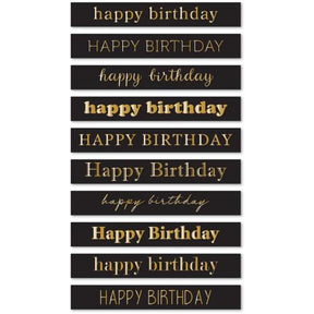 Memory Box Happy Birthday Foil Greetings Large Black Tabs provide 20 black greeting tabs, each featuring gold-foiled "Happy Birthday" text in 10 different fonts. This pack includes 2 of each of the 10 unique designs. Each tab measures approximately 3 x 4.25 inches, offering a stylish addition to your projects.