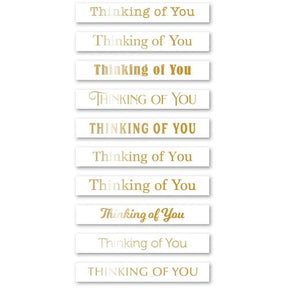 Memory Box Thinking of You Foil Greetings White Tabs provide 40 white greeting tabs, each featuring gold-foiled “Thinking of You” text in 10 different fonts. This pack includes 4 of each of the 10 unique designs. Each tab measures approximately 1.75 x 0.25 inches, offering a stylish addition to your projects.