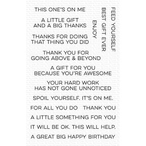 Sentiments: This One’s on Me, a Little Gift and a Big Thanks, Thank You for Doing That Thing You Did, Enjoy, Best Gift Ever, Feed Yourself, Thank You Fo Going above & Beyond, a Gift for You Because You’re Awesome, Your Hard Work Has Not Gone Unnoticed, Spoil Yourself, It’s on Me, for All You Do, Thank You, a Little Something for You, It Will Be OK. This Will Help., a Great Big Happy Birthday