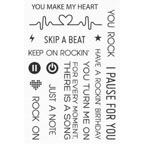 Keep On Rockin' has been updated from a 4" x 8" set to a 4" x 6" set. Some sentiments and images have been removed to fit this new size. The "You Make My Heart Skip a Beat" sentiment has been split into three parts to provide the ability to change the positioning of each line and choose whether you'll use the heartbeat line design with the sentiment.