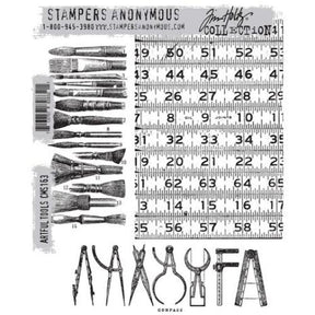 Tim Holtz Cling Mount Stamps: Artful Tools. Vintage supplies make for great artistic elements and this set of artful tools will give your next collage a bit of interest too. Three deeply etched red rubber cling mount rubber stamps that adhere to any clear acrylic block. We highly recommend using them with Tim Holtz Grid-Blocks. Block of rulers measures approximately 4" x 6", brushes measure approximately 2 1/8" x 4 7/8". Stamps come on a 3-hole punched sheet for easy storage.