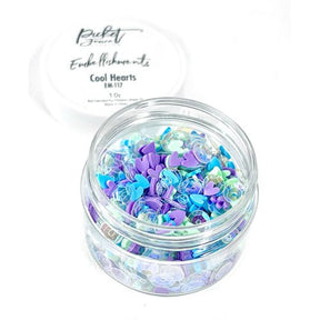 1 oz jar containing blue, green and purple clay hearts with clear iridescent sequins in multiple sizes.