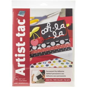 Grafix-Artists Tac. Grafix Artist-tac is an adhesive that only goes where you want. Made up of two protective liner sheets that pull apart to expose the double sided micro adhesive dots. It works by transferring a super fine layer of adhesive dots, ensuring full edge to edge coverage even on small, irregular shaped items. This package contains twenty-five 11x8-1/2 inch sheets of high tac dry adhesive. Acid free. Made in USA.