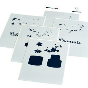5 piece layering stencil set made to coordinate with the Celebrate in Style stamp set and Celebrate in Style die. There is a separate stencil for each layer, with guidelines on each stencil for perfect alignment when using alone. When using the stencils with the stamped images you will forego the alignment guides, and instead align each layer to the stamped images.