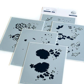 5 piece layering stencil set made to coordinate with the Lush Peonies stamp set and Lush Peonies die. There is a separate layer, with guidelines on each stencil for perfect alignment every time. Use them without the stamped image for a soft, no-line coloring feel. Use the coordinating stamp to add more detail to the image by stamping in detail black, or heat embossing in gold. Stencils measure approximately 4.25” x 5.5”.