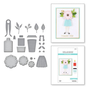 I Dance Etched Dies from the Happy Dance Collection has a set of 19 thin metal dies. When assembled, it creates a lady dancing for joy holding a wonderful flower, a warm coffee cup or a big bottle of glue! Her legs are the kinetic feature of the design to become interactive!