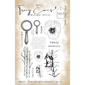 This beautiful stamp includes 7 Focal images, 1 background stamp and 6 sentiment/wording stamps. This stamp set offers so many possibilities from Birch Trees perfect for scenes or stand alone designs to complimentary designs that can be combined with the birch trees. There are also two gorgeous pansy flowers in two different sizes; the larger one being approx. 2.5 inches in length and the smaller one 1.5 inches in length. Both could be used for background or focal images on a variety of substrates. The magnifying glass offers a fun quirky touch which is a perfect design element for male or female projects. The larger magnifying glass measures almost 2.75 inches in length and the smaller one 1.5 inches in length approx.