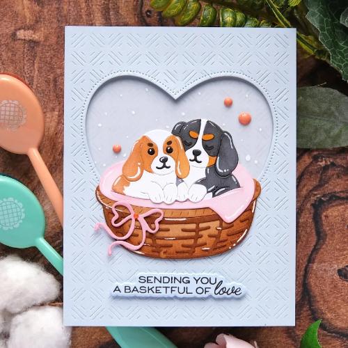 Waffle Flower Basketful Base Dies is a set of 8 pieces designed to create a detailed basket, complete with accessories like a tulip and bow for decoration. This set is perfect for building a fun scene when paired with the Basketful of Puppies Die-n-stencil 422376 and Basketful of Bunny Duo Die-n-stencil 422375, both sold separately.