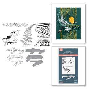 Woodland Tales Impressions Press Plate & Die Set is part of the Woodland Tales Collection. Natural elements such as a bird, texture pattern, fern and leaves are included in this set of five press plates and one thin metal cutting die. A press plate with four sentiments and a coordinating die to cut all at once complete this offering. Ink the plates with the BetterPress Ink to be pressed against the BetterPress Cotton Card Panel and Sheets for a crisp letterpress design.
