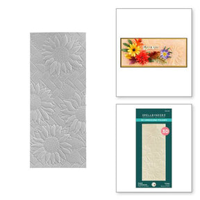 Basket of Sunflowers 3D Embossing Folder is part of the Birds & Bees Garden Collection by Susan Tierney-Cockburn. This 3D Embossing Folder can texturize a surface of a slimline card size (3.5 x 8.5-inch) with sunflower blooms randomly placed against a basket weave background. Perfect backdrop to a fall-themed project. For the most detailed impression, lightly mist the cardstock with water before embossing.