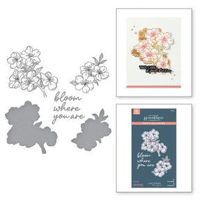 Cherry Blossoms BetterPress Plate & Die Set is from the Spring in Kyoto Collection by Alex Syberia Designs. The two plates impress two cherry blossom clusters in full bloom and a sentiment, Bloom Where You Are. Each has a corresponding die to cut out. Ink the plates with the BetterPress Ink to be pressed against the BetterPress Cotton Card Panel and Sheets for a crisp letterpress design.