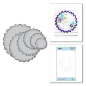 Classic Scalloped Circles Small offers a six piece Nestabilities® die template set of scalloped edge Circles. There are 22 scallops on each die template, scaled down as the die templates decrease in size by .25 in. The largest die template features .25 in wide scallops. The difference between die template sizes within a Nestabilities® set is .25 in, which becomes a .25 in border when layering. The difference between LG and SM Nestabilities® sets is .25 in. Combing both the LG and SM sets of Nestabilities® will allow for .875 in borders when layering. Spellbinders® Nestabilities® cut, emboss and stencil with a single die template.