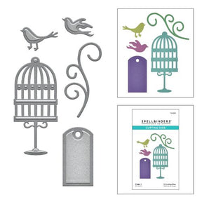 Flight 1 Etched Dies is a set of five thin metal dies. It includes two sweet birds, a delicate cage, a dainty swirl and a rounded top tag. Layer the pieces together to create a singing bird in a cage, or set the bird free!