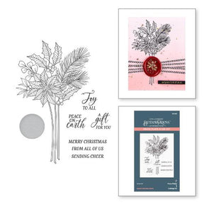 Sealed Poinsettia Stems Press Plate & Die Set is part of the Sealed 3D Christmas Collection. It is a set of seven press plates and one thin metal cutting die. The largest plate is a lovely holiday sprig full of Poinsettia blossoms, pine needles and cones, along with some holly berries. The other plates are sentiment options in a line format or fits in a seal circle die, also included in the offering. Ink the plates with the BetterPress Ink to be pressed against the BetterPress Cotton Card Panel and Sheets for a crisp letterpress design.<