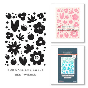 Sweet Life Floral Press Plates is the March 2025 release for the independent retailers' exclusive BetterPress Society. This large plate in this set presses a 4" x 5.25" card panel with a bright array of cheerful blooms and greenery. This pretty plate is perfect for graphic backgrounds, simple one-and-done cards, and fun ombre inking. Also included are two strip sentiments: 'Best Wishes' and 'You Make Life Sweet.'