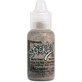 A plastic bottle glitter glue. Non-setting and featuring an easy flow tip. Makes your art sparkle and enhances rubber stamped designs, adds excitement to greeting cards, letters, envelopes, holiday and party decorations. Available in a variety of colors, each sold separately. This package contains one Ranger Stickles, 0.5 ounces. Acid free, non-toxic. Conforms to ASTM D4236. Made in USA.
