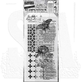 Tim Holtz Mixed Media Set includes clear photopolymer stamps & a custom layering stencil designed to add texture & imagery to your creativity. Use with your favorite inks, paints, sprays, and embossing pastes.