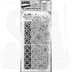 Tim Holtz Mixed Media Set includes clear photopolymer stamps & a custom layering stencil designed to add texture & imagery to your creativity. Use with your favorite inks, paints, sprays, and embossing pastes.