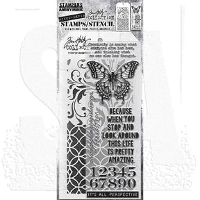 Tim Holtz Mixed Media Set includes clear photopolymer stamps & a custom layering stencil designed to add texture & imagery to your creativity. Use with your favorite inks, paints, sprays, and embossing pastes.