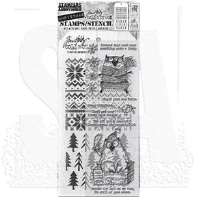 Tim Holtz Mixed-Media Stamps & Stencil Set: Snarky Cat Christmas, Holiday Knit and Pines THMM134