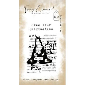 The Tracy Evans Boutique Designs Art Backdrop A8 Clear Stamps set, measuring 2 x 4 inches, comprises two high-quality photopolymer stamps, deeply etched for precise impressions. This stamp set features a collage of typed rows of numbers with the word "ART" printed numerous times on top, creating a captivating backdrop reminiscent of an artistic workspace. The sentiment, "Free your imagination," encourages creativity.
