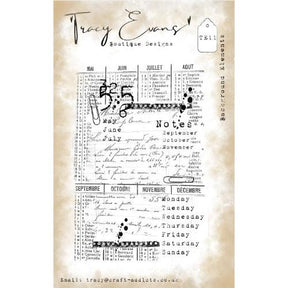 The Tracy Evans Boutique Designs Background Elements A7 Clear Stamps set, measuring 3 x 5 inches, features one high-quality photopolymer stamp, deeply etched for precise impressions. This stamp set presents a captivating collage of French months with ledger information, adorned with handwritten notes on top, along with the days of the week, splotches, paper clips, and notes. The eclectic mix of elements adds depth and character to your projects, offering versatile options for creating captivating backgrounds or adding unique details to your creations.