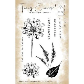 Tracy Evans Boutique Designs Design in Nature A6 Clear Stamps, measuring 4 x 6 inches, has 7 high-quality photopolymer stamps, deeply etched for precise impressions. Included are a stemmed flower, a cornflower bloom, a leaf with sprigs of flowering plants, and sentiments like "A Quiet Place" and "Delight in Nature," along with the words "Catananche" and "Persicaria." Whether you're crafting cards, scrapbook pages, or other projects, these stamps offer versatility and elegance to enhance your creations.