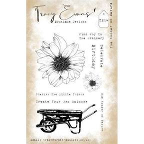 The Tracy Evans Boutique Designs The Wonder of Nature A6 Clear Stamps set, measuring 4 x 6 inches, comprises 9 high-quality photopolymer stamps, each deeply etched for precise impressions. Included are a large and small bloom, a wheelbarrow, and the words "Birthday" and "Celebrate." Additionally, the set features sentiments such as "Find joy in the ordinary," "Cherish the little things," "The wonder of Nature," and "Create your own rainbow." With its versatile elements and heartfelt messages, this stamp set is perfect for adding a touch of natural beauty and positivity to your crafting projects.