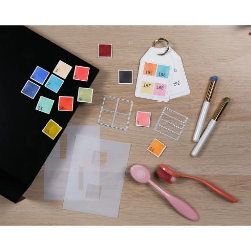 Use the stencil to add color to both the tags and the rectangles. It’s an easy way to highlight the beautiful piercing details and create interesting ink-blended backgrounds.